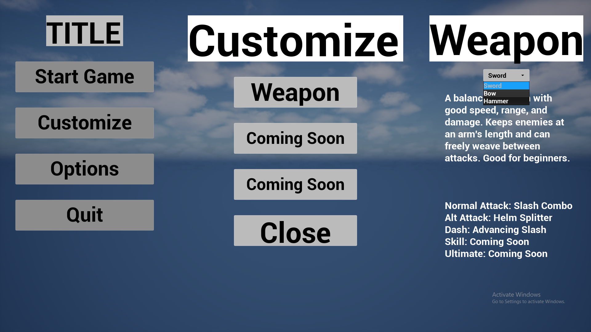 The prototype currently contains 3 weapons the players can choose between: A sword, a bow, or a hammer. Once a weapon has been chosen the player can then play through a single level of two separate enemy types to test out the game's combat systems.